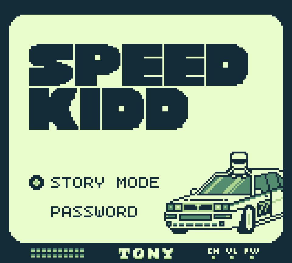 Speed Kidd is a retro racing game for the Game Boy where you participate in the World Tour, a championship that will take you across 12 different tracks (both real and fictional) around the world in a ~1 hour long story mode. Meet 7 incredible competitors and beat them all to become the champion!